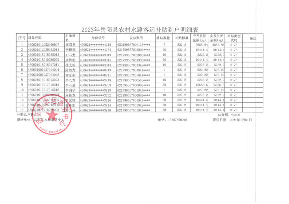2024年发放2023年农村水路客运补贴(个体经营部分)