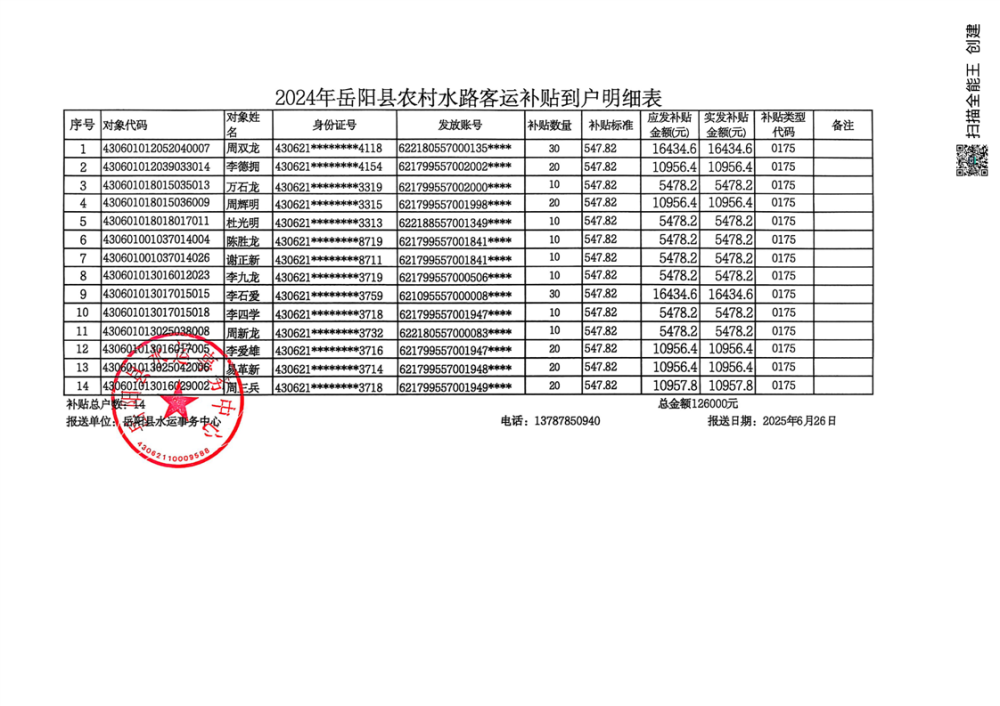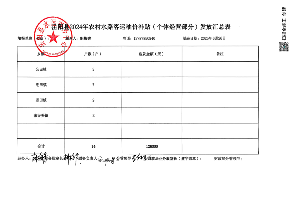 2025年发放2024年度岳阳县农村水路客运油价补贴