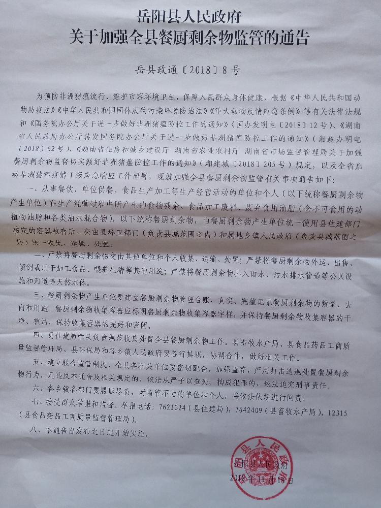 关于加强全县餐厨剩余物监管的通告