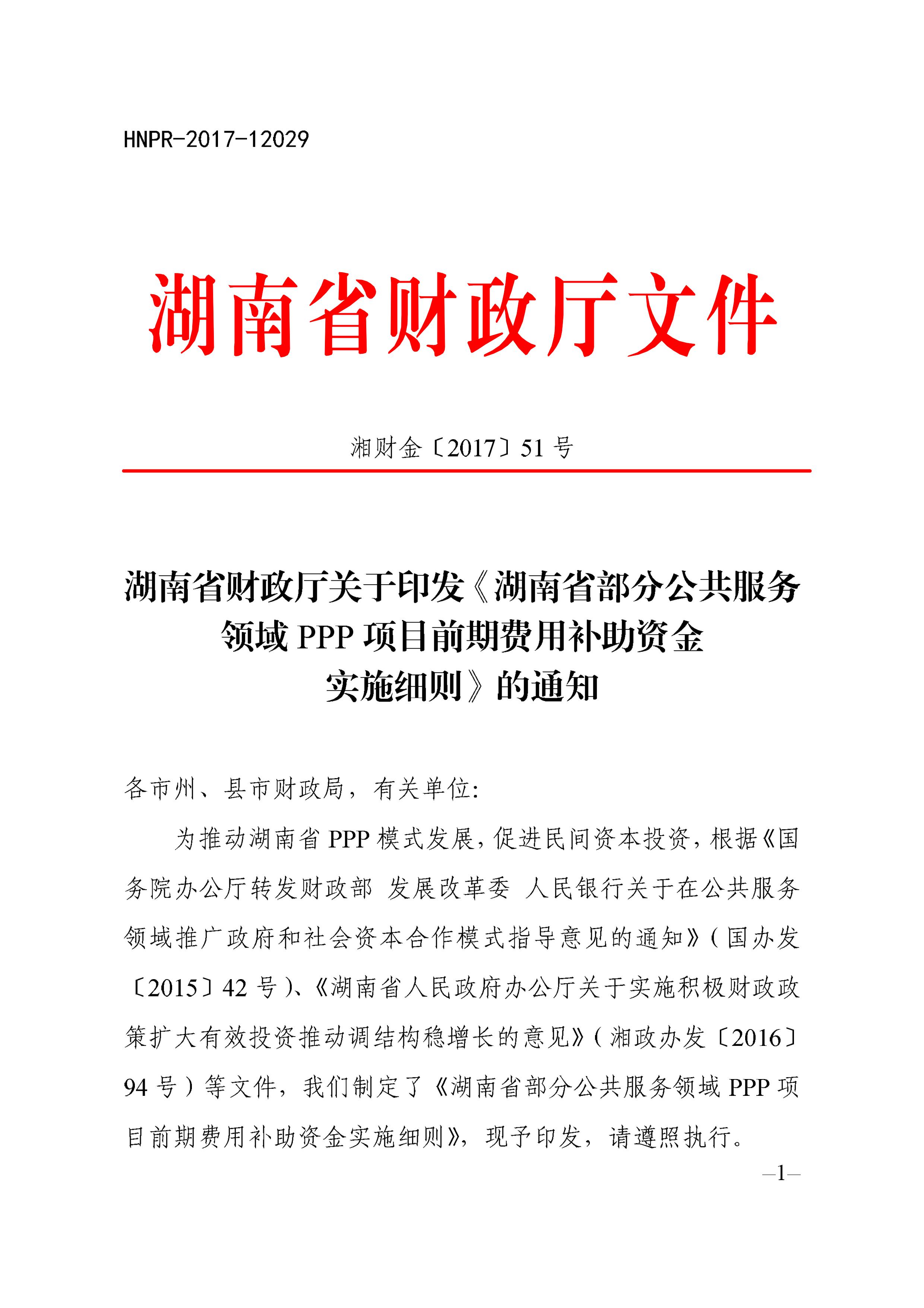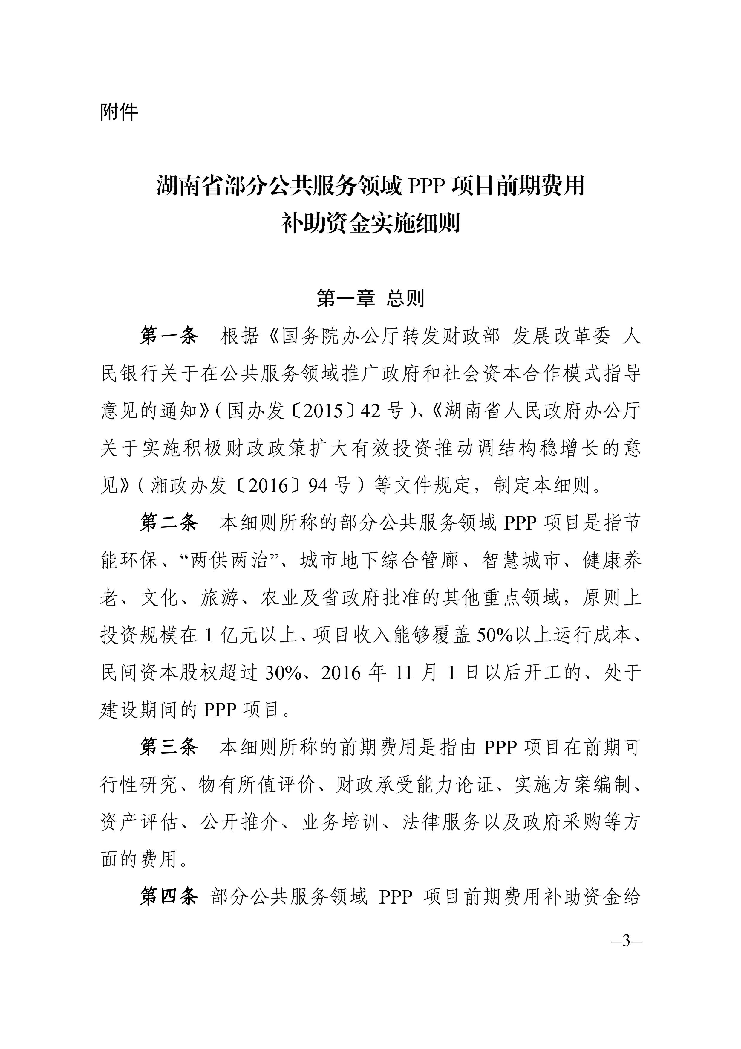 湖南省部分公共服务领域PPP项目前期费用补助资金实施细则