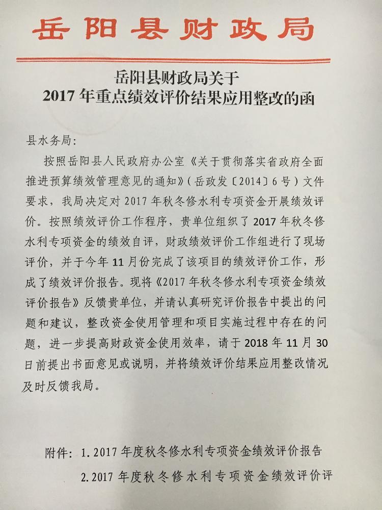 关于2017年重点绩效评价结果应用整改的函(秋冬修水利)