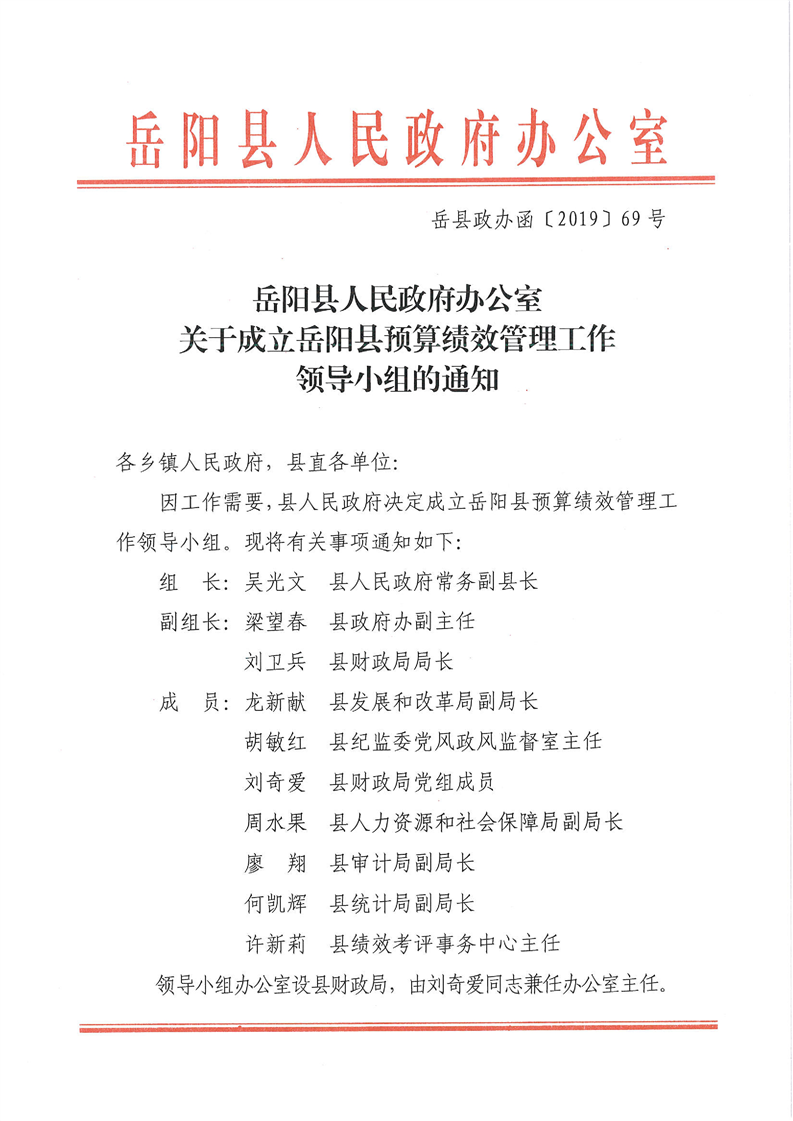 岳阳县人民政府关于成立县预算绩效管理工作领导小组的通知