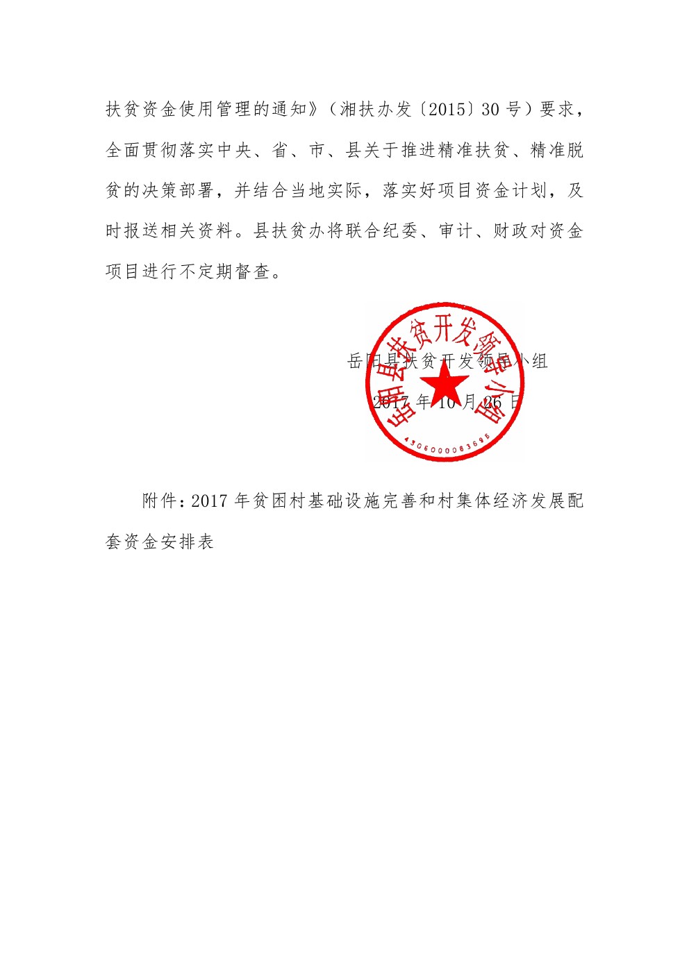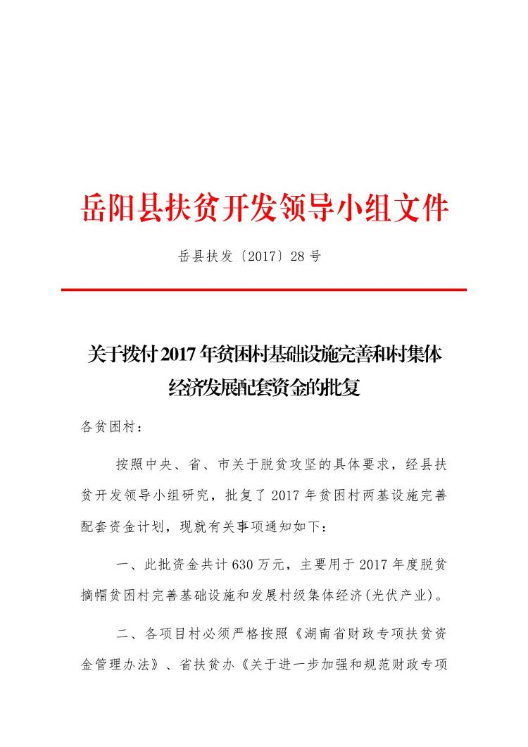 岳县扶发【2017】28号——关于拨付2017年贫困村两基设施完善配套资金的批复