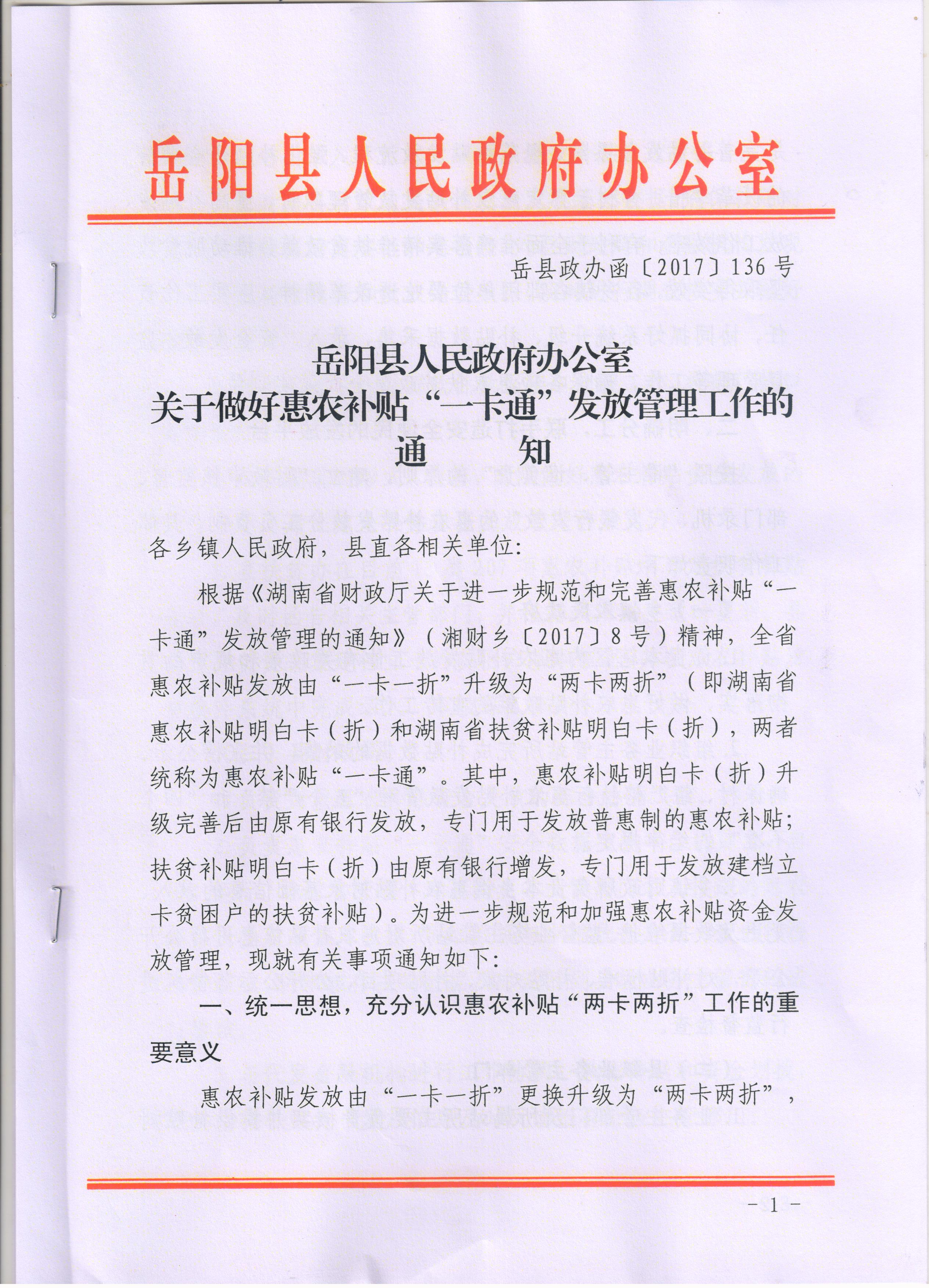 关于做好惠农补贴“一卡通”发放管理工作的通知
