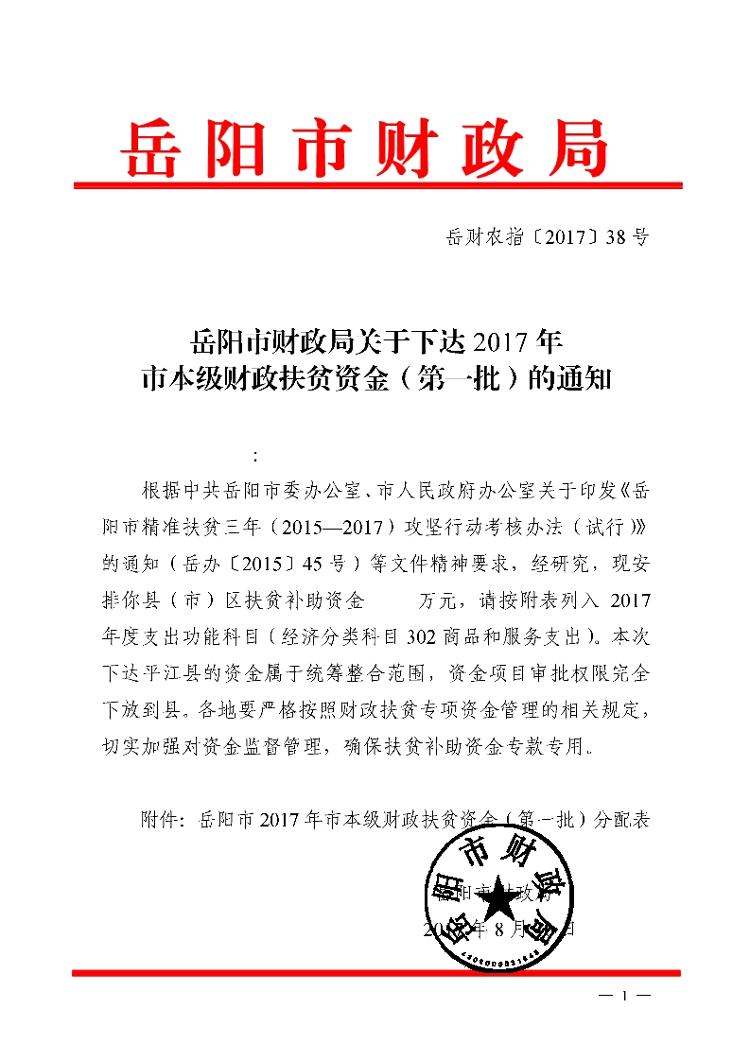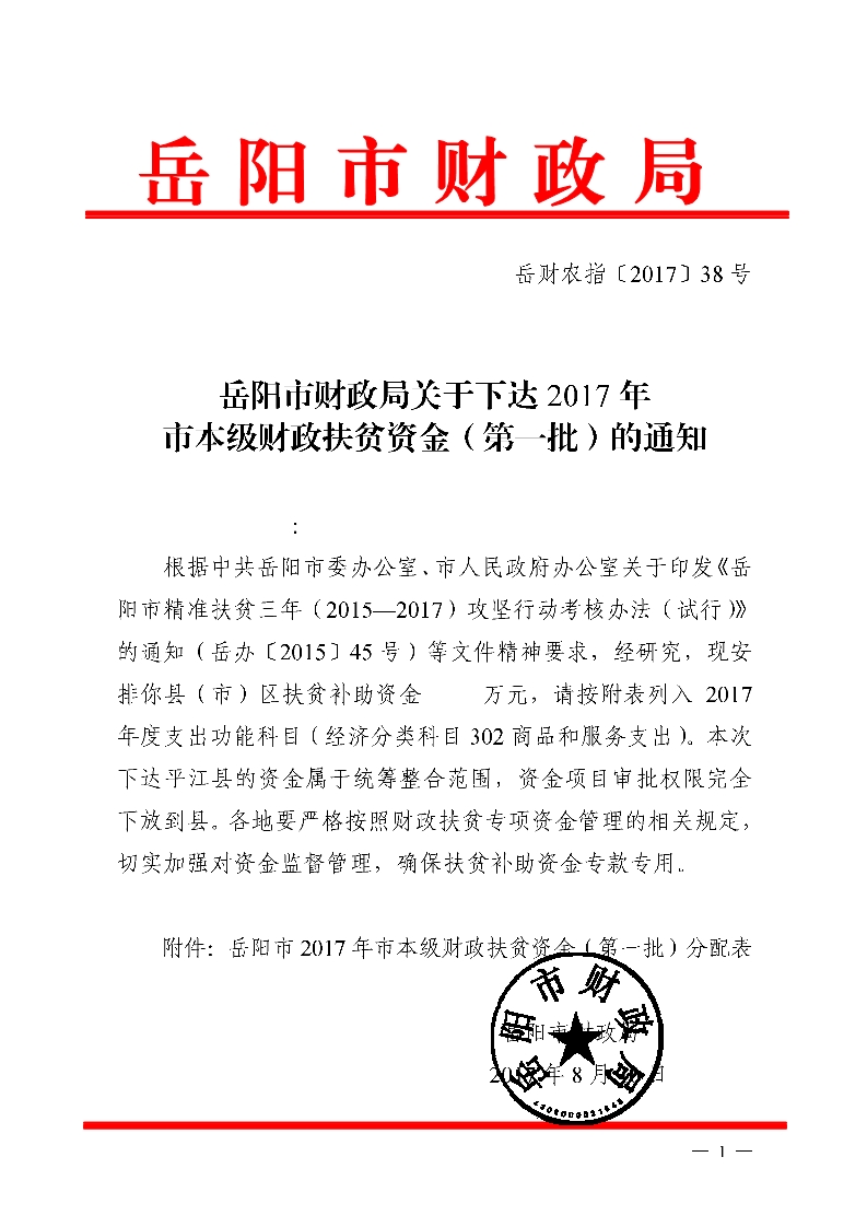 | 岳阳市2017年市本级财政扶贫资金(第一批)分配表 |