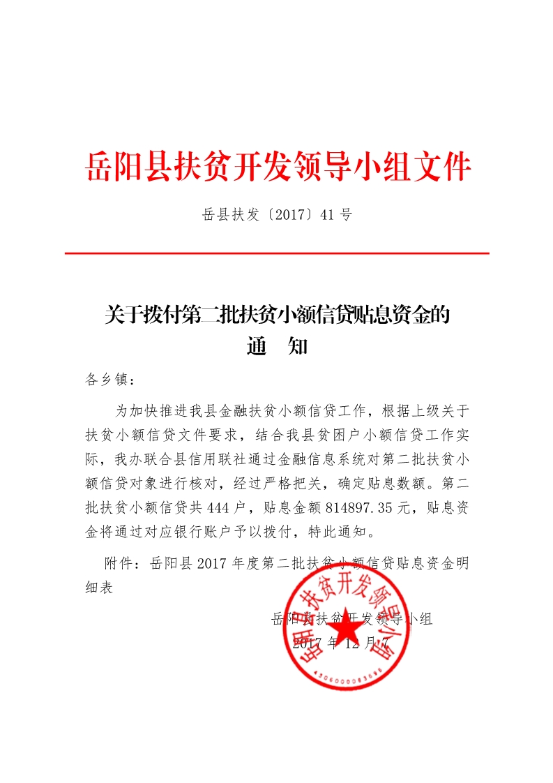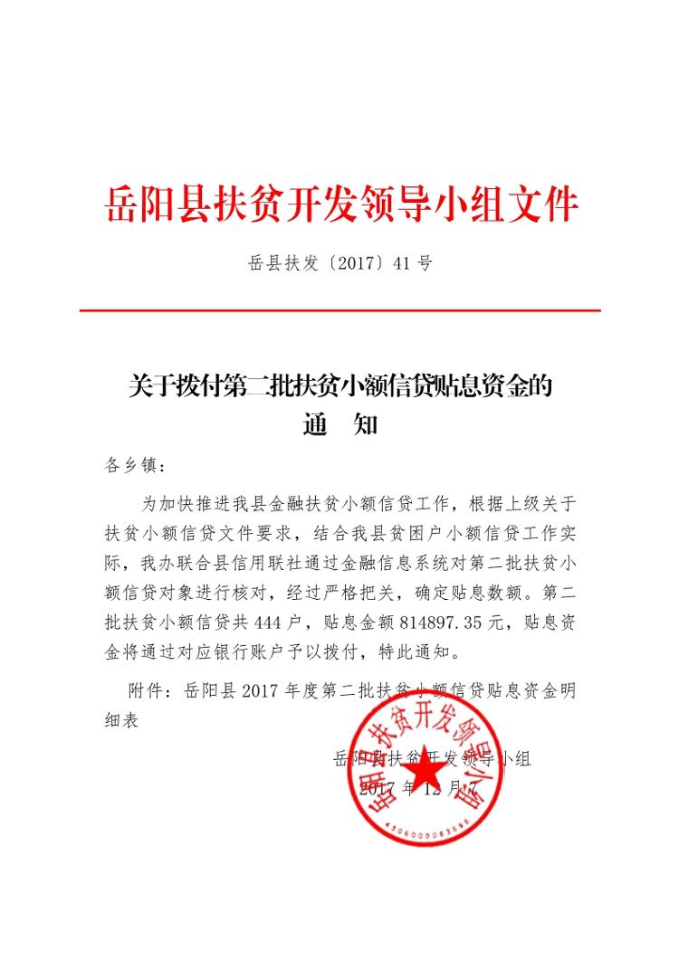 岳县扶发【2017】41号拨付第二批扶贫小额信贷贴息资金的通知