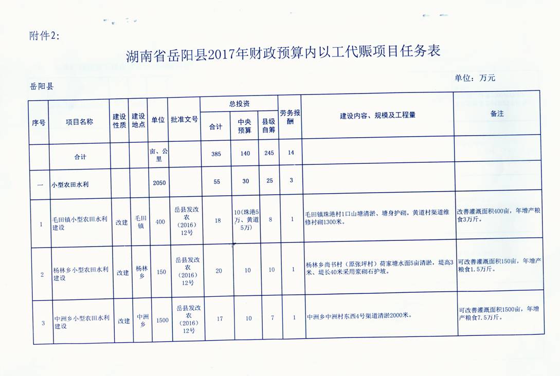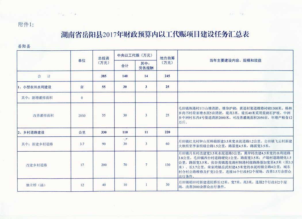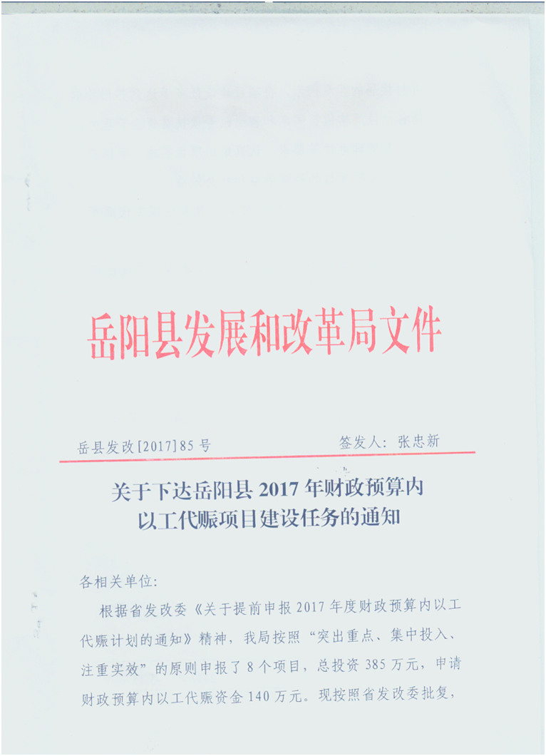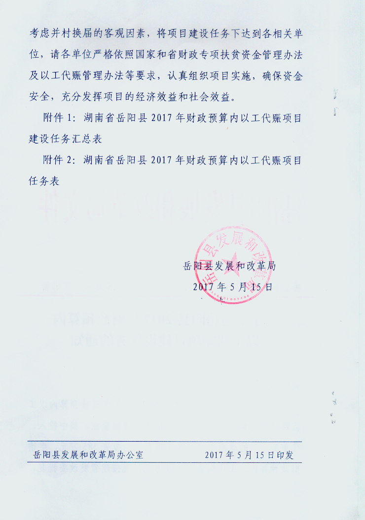 关于下达岳阳县2017年财政预算内以工代赈项目建设任务的通知