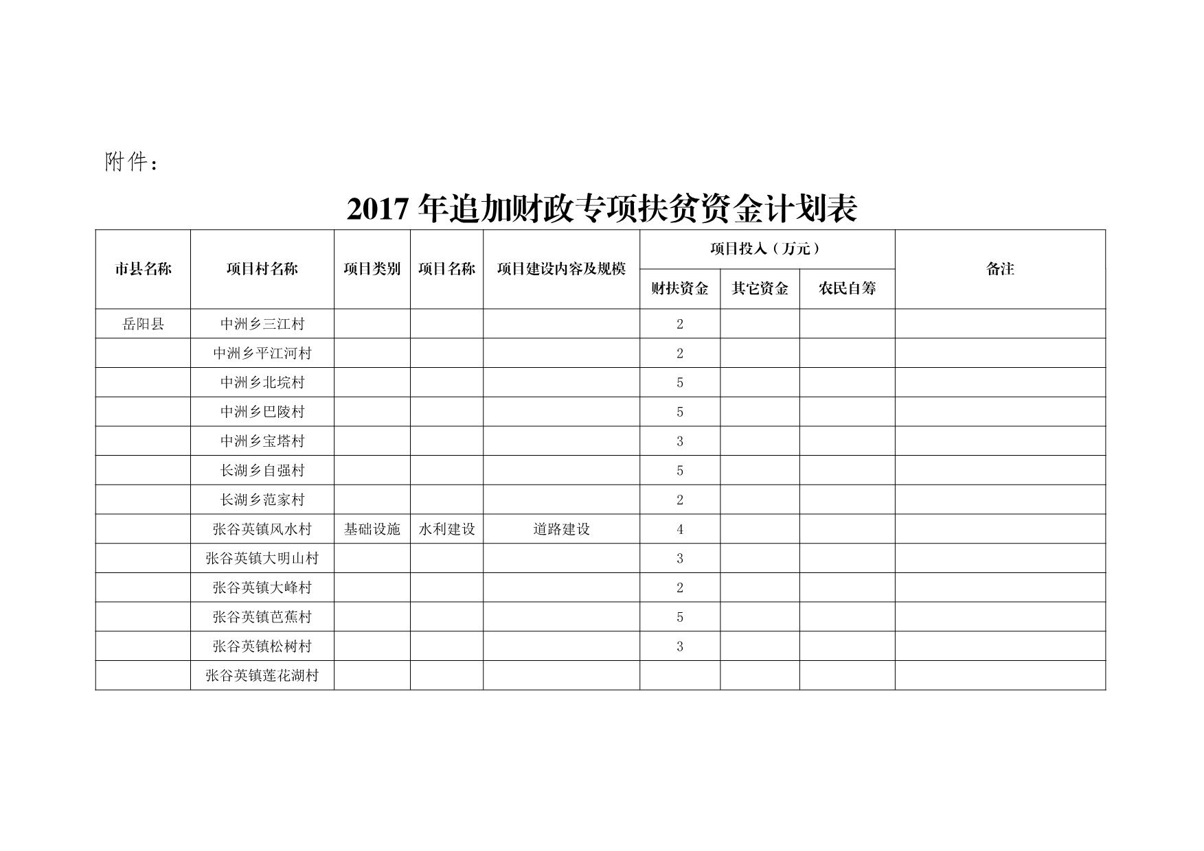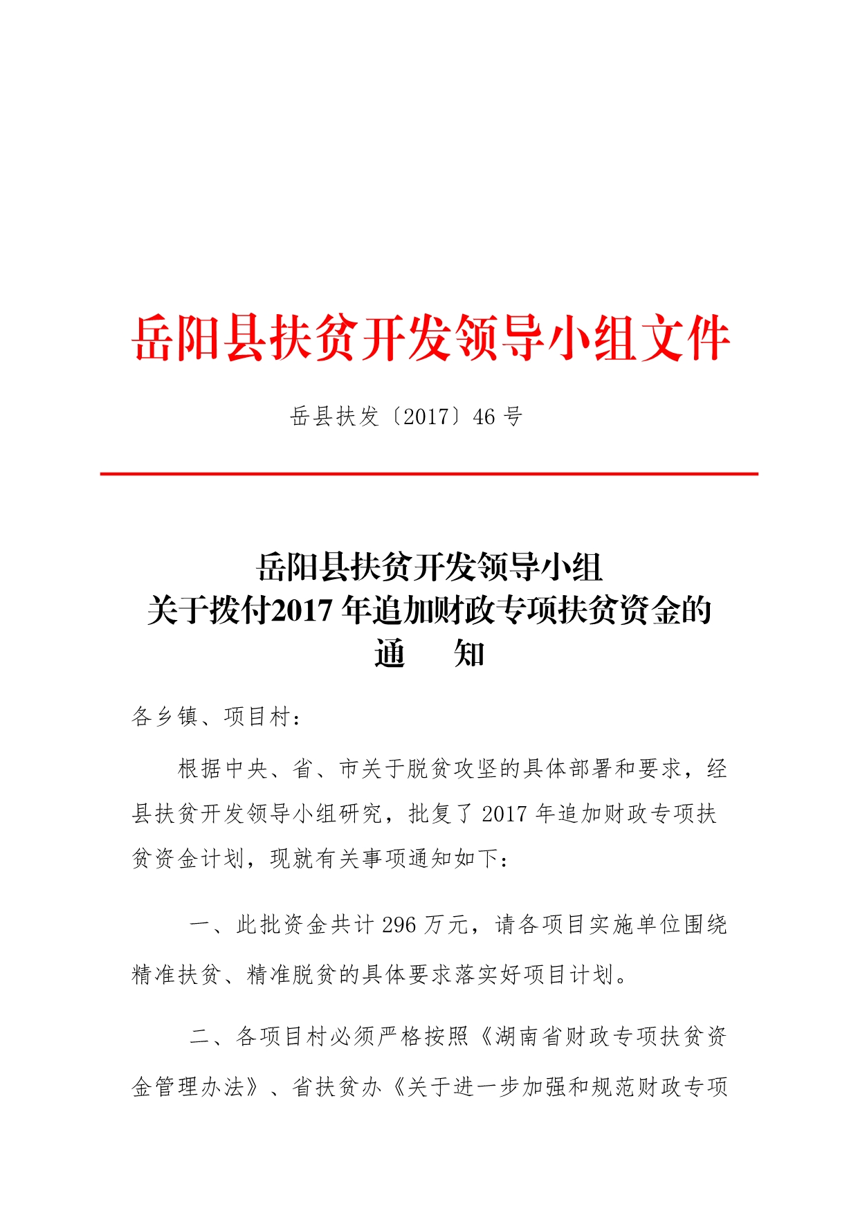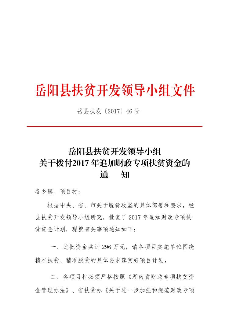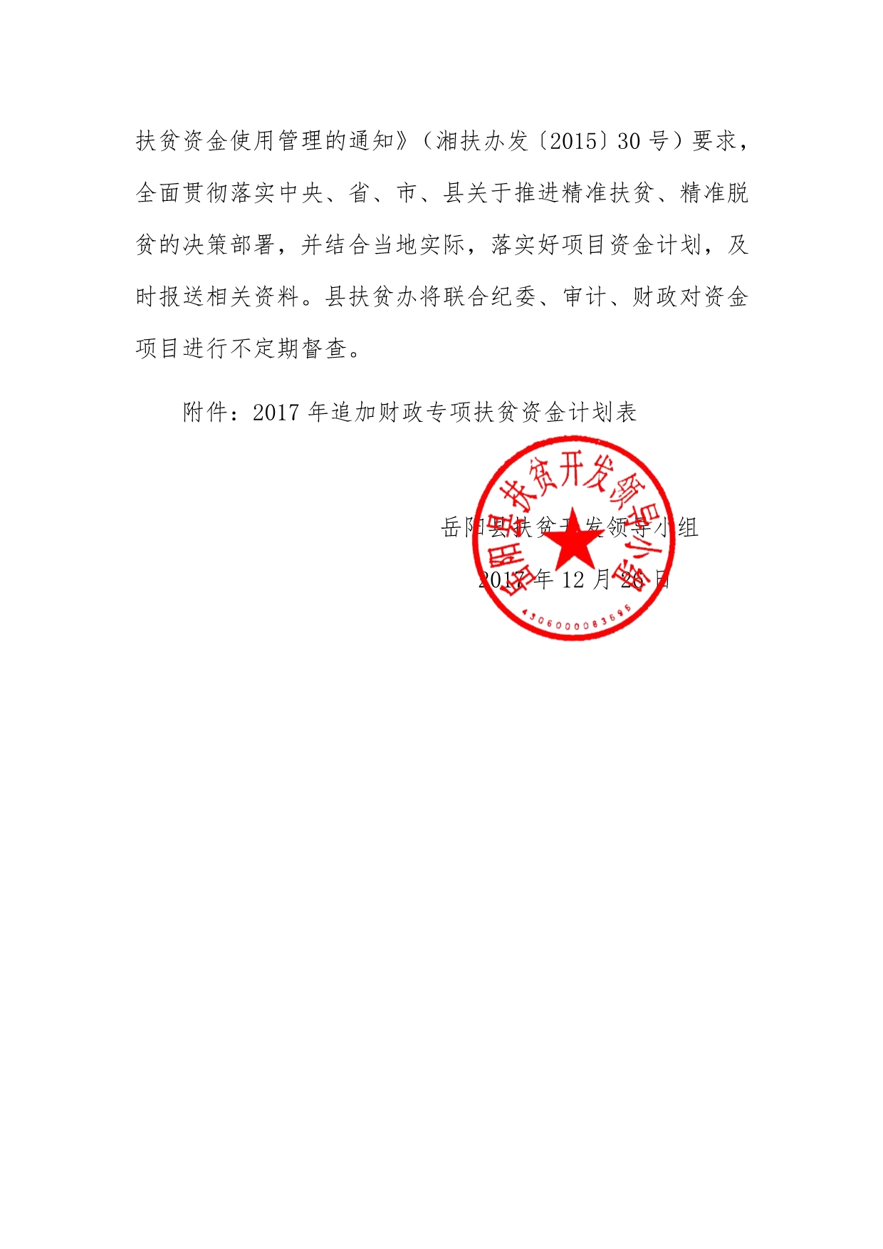 岳阳县扶贫开发领导小组关于拨付2017年追加财政专项扶贫资金的通知