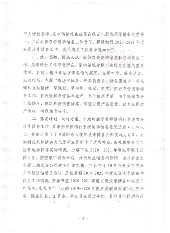 岳阳市供销合作联社关于认真做好2020-2021年度农资淡季储备工作的通知