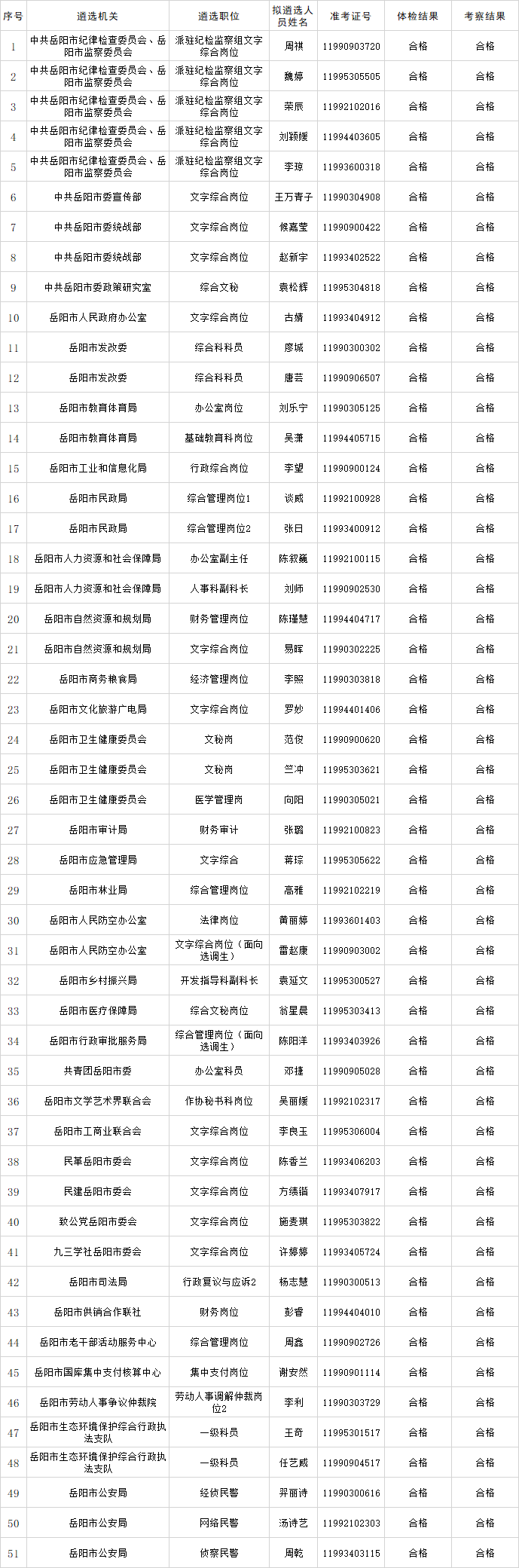 根据《2022年岳阳市市直机关公开遴选公务员公告》要求,经笔试、面试、体检、考察、遴选机关党委(党组)集体研究等程序,现确定周祺等51名同志为拟遴选人员,现按要求予以公示: