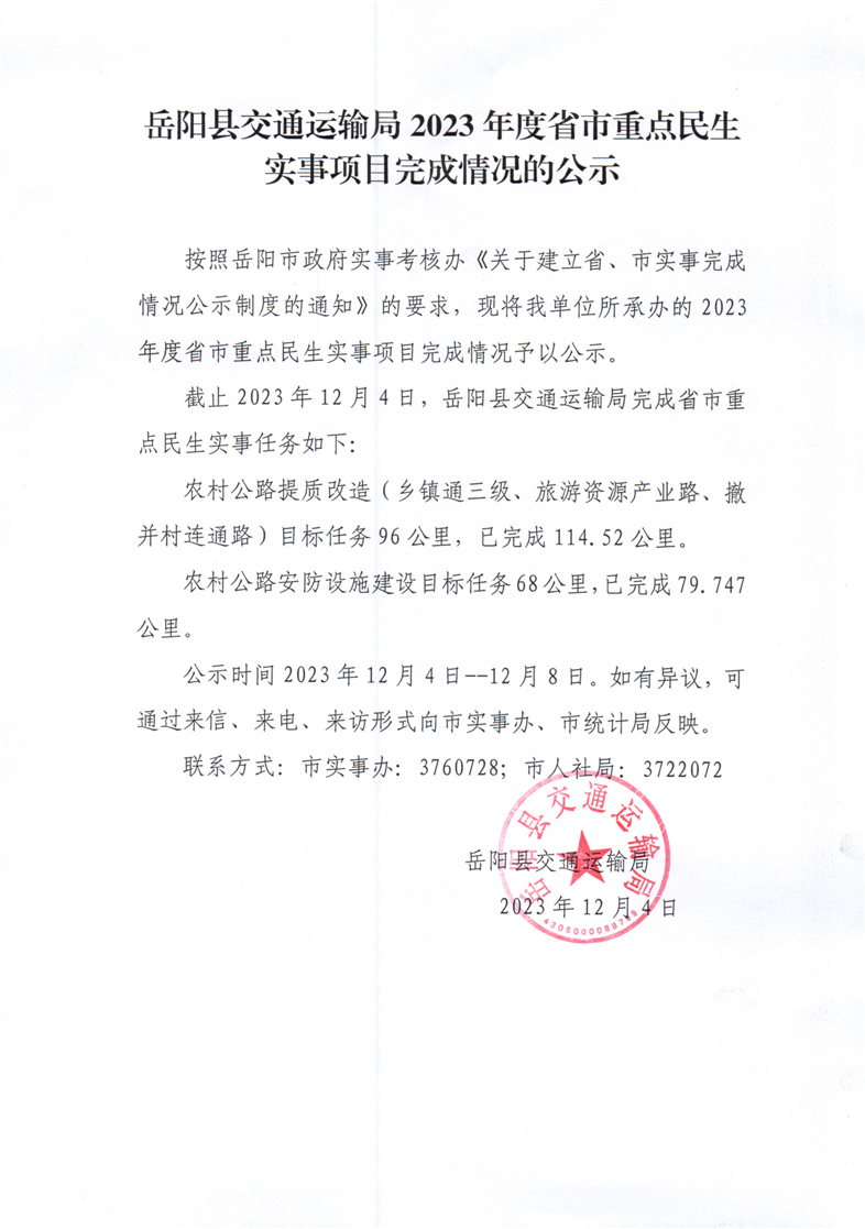 岳阳县交通运输局2023年度省市重点民生实事项目完成情况的公示