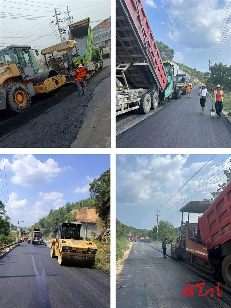 9月9日,S308线月田至公田段应急抢险工程施工现场,运输车辆来回穿梭,摊铺机缓缓前进将沥青铺设在道路表面,压路车来回压实确保路面的密实度和平整度,养护工人们顶着烈日和高温沥青的双重“烤”验,手拿铁锹将沥青均匀地填满道路各个角落,机械的轰鸣声与养护工人的交谈声交织在一起,一派热火朝天的景象。