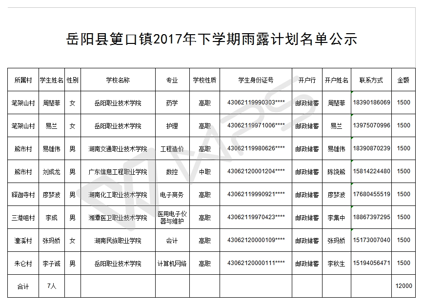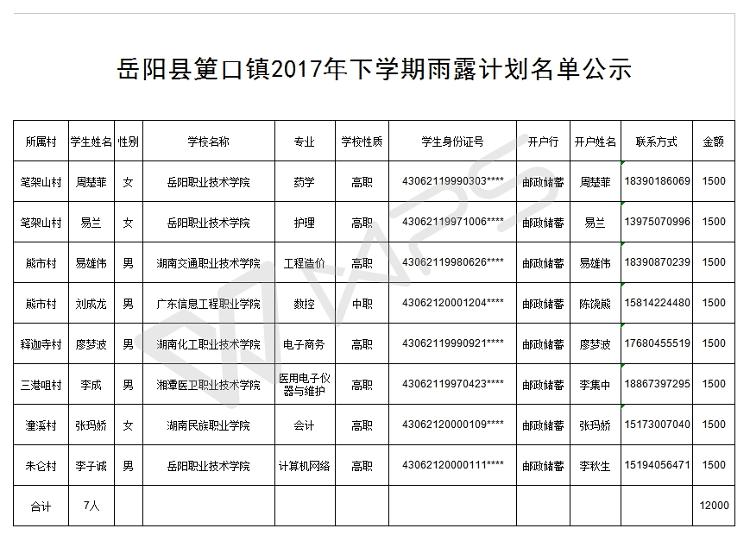 岳阳县筻口镇2017年下学期雨露计划名单公示