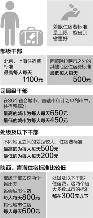 从公布的差旅住宿费标准明细表来看,部级干部出差到北京、上海的住宿费标准最高,为每人每天1100元;部级干部住宿费标准最低的,是西藏除拉萨市之外的其他地区,每人每天500元。在36个省会城市、直辖市和计划单列市中,司局级干部住宿费标准最高的城市为每人每天650元,最低的城市为每人每天450元。处级及以下干部住宿费标准,不同地区之间的差距较大,标准最高的是500元,最低为200元。