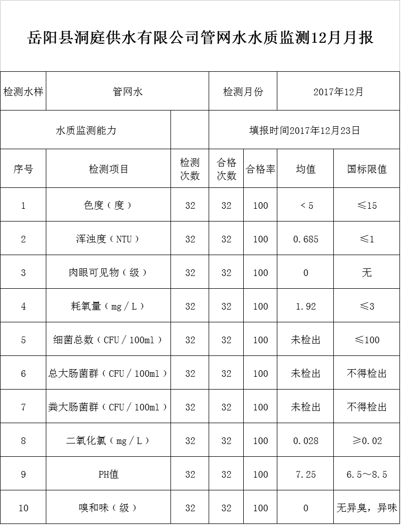 岳阳县洞庭供水有限公司管网水水质监测12月月报