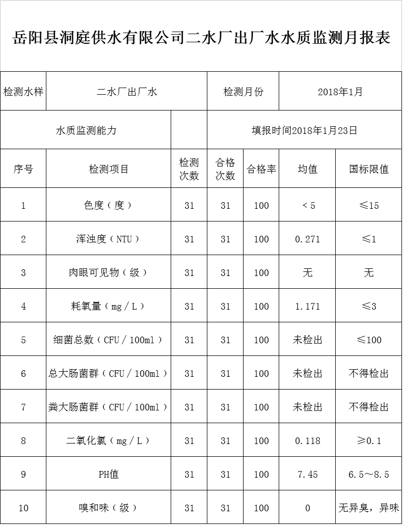 岳阳县洞庭供水有限公司二水厂出厂水水质监测2018年1月月报表