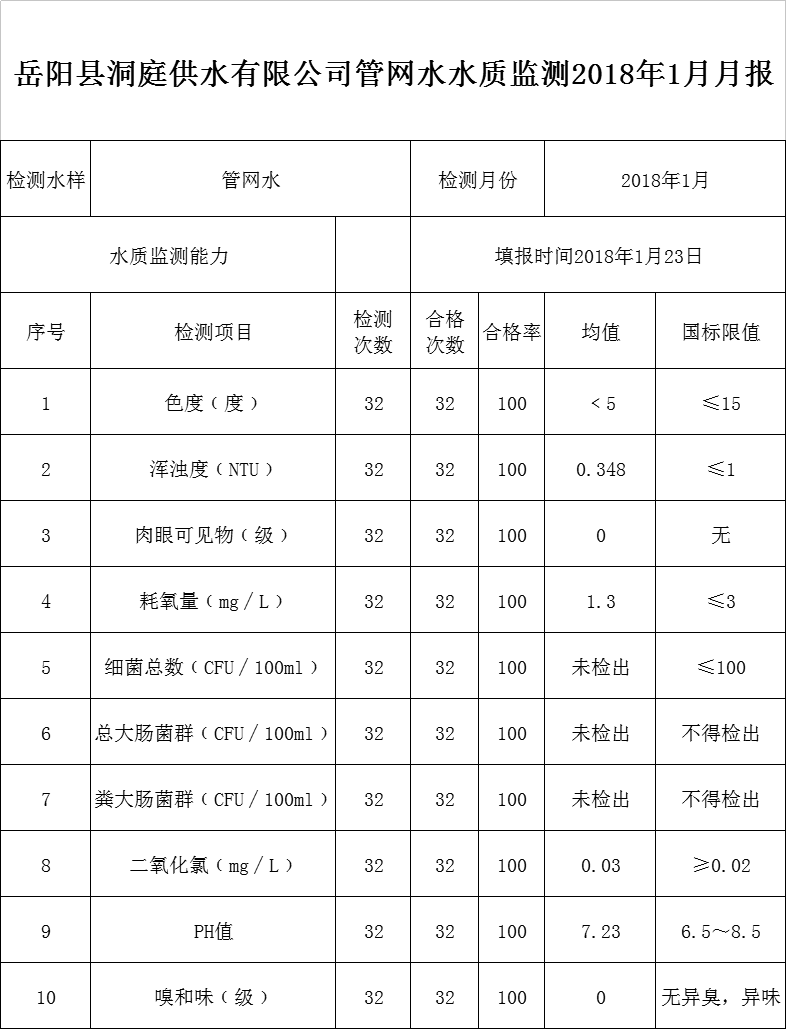 岳阳县洞庭供水有限公司管网水水质监测2018年1月月报