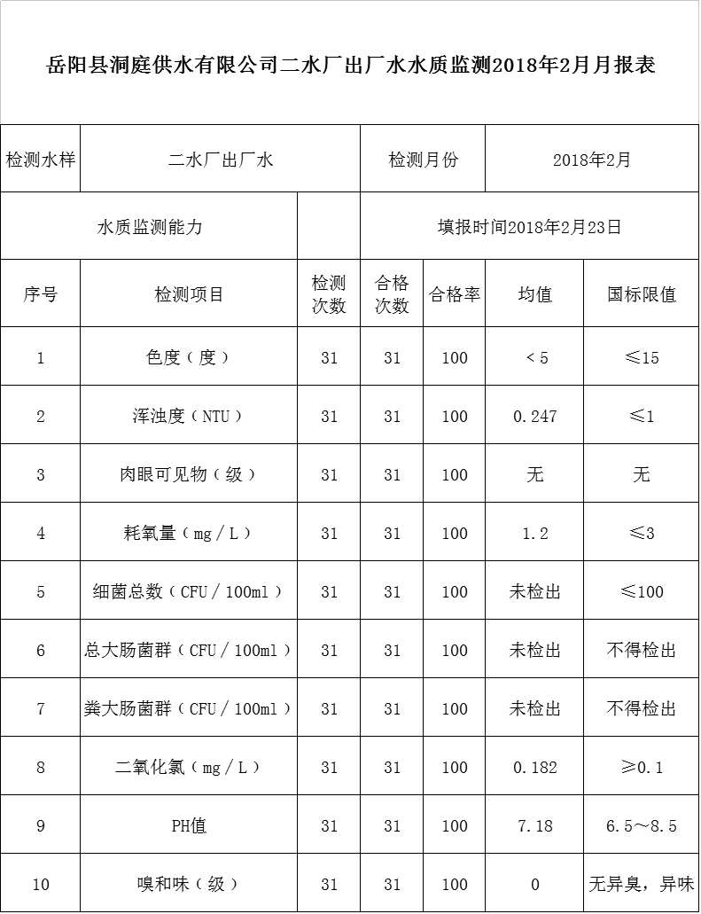 岳阳县洞庭供水有限公司二水厂出厂水水质监测2018年2月月报表