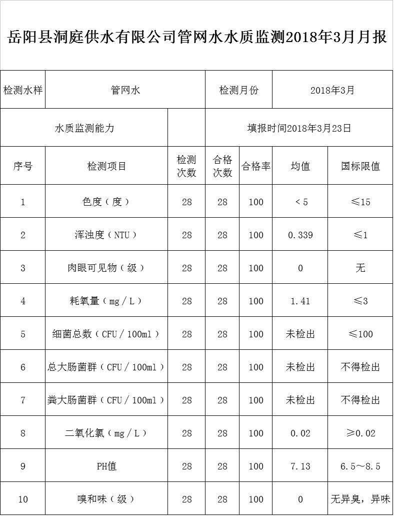 岳阳县洞庭供水有限公司管网水水质监测2018年3月月报