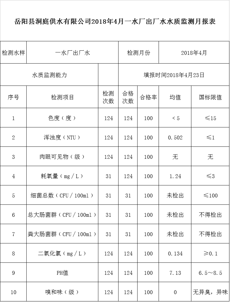岳阳县洞庭供水有限公司2018年4月一水厂出厂水水质监测月报表
