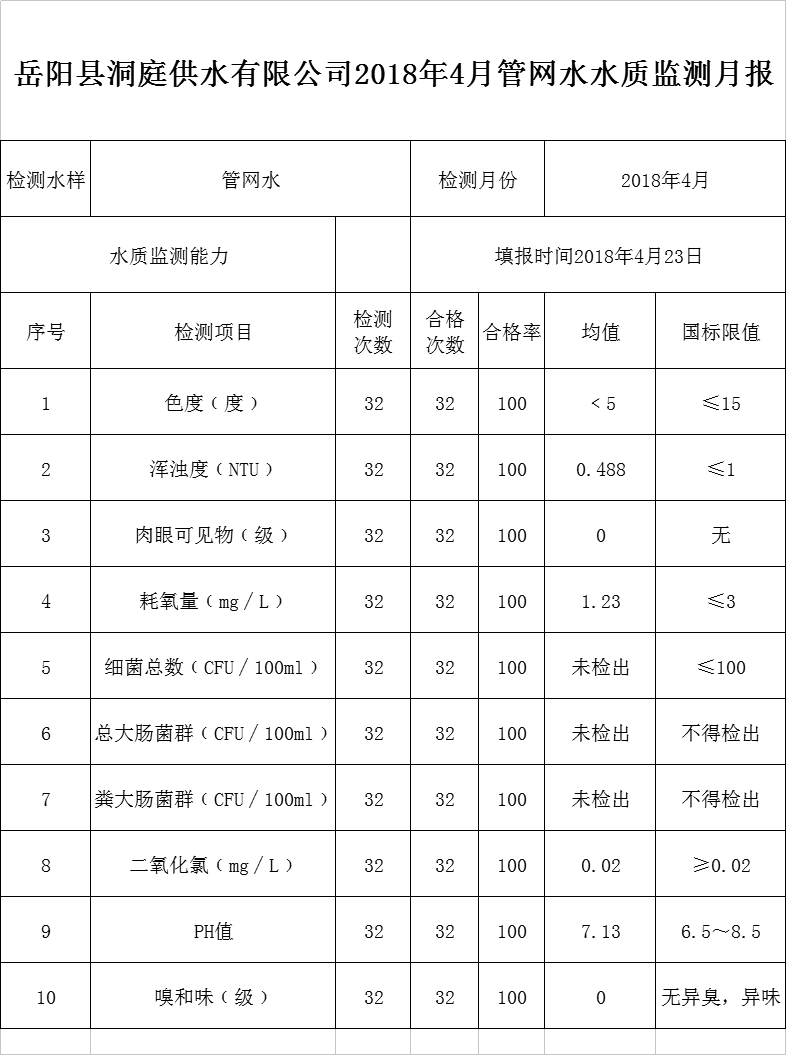 岳阳县洞庭供水有限公司2018年4月管网水水质监测月报