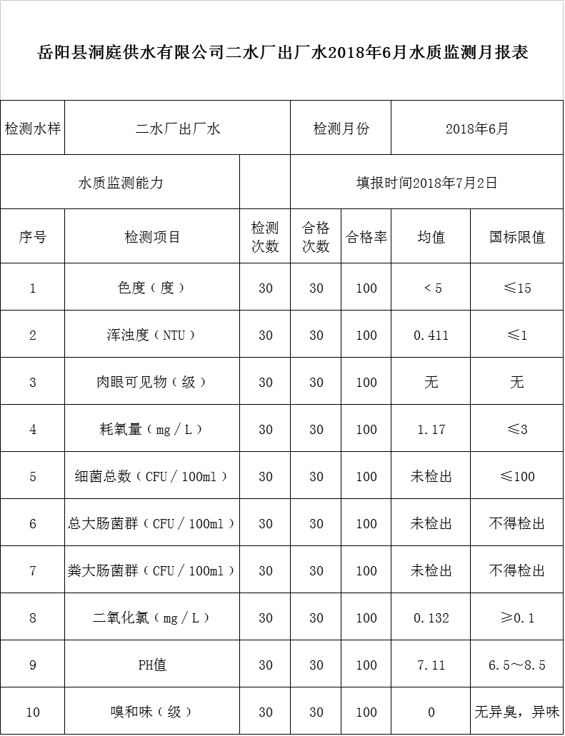 岳阳县洞庭供水有限公司二水厂出厂水2018年6月水质监测月报表