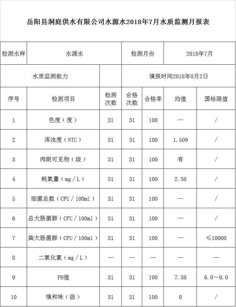 岳阳县洞庭供水有限公司水源水2018年7月水质监测月报表