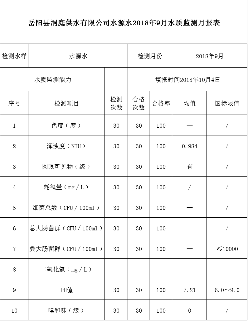 岳阳县洞庭供水有限公司水源水2018年9月水质监测月报表