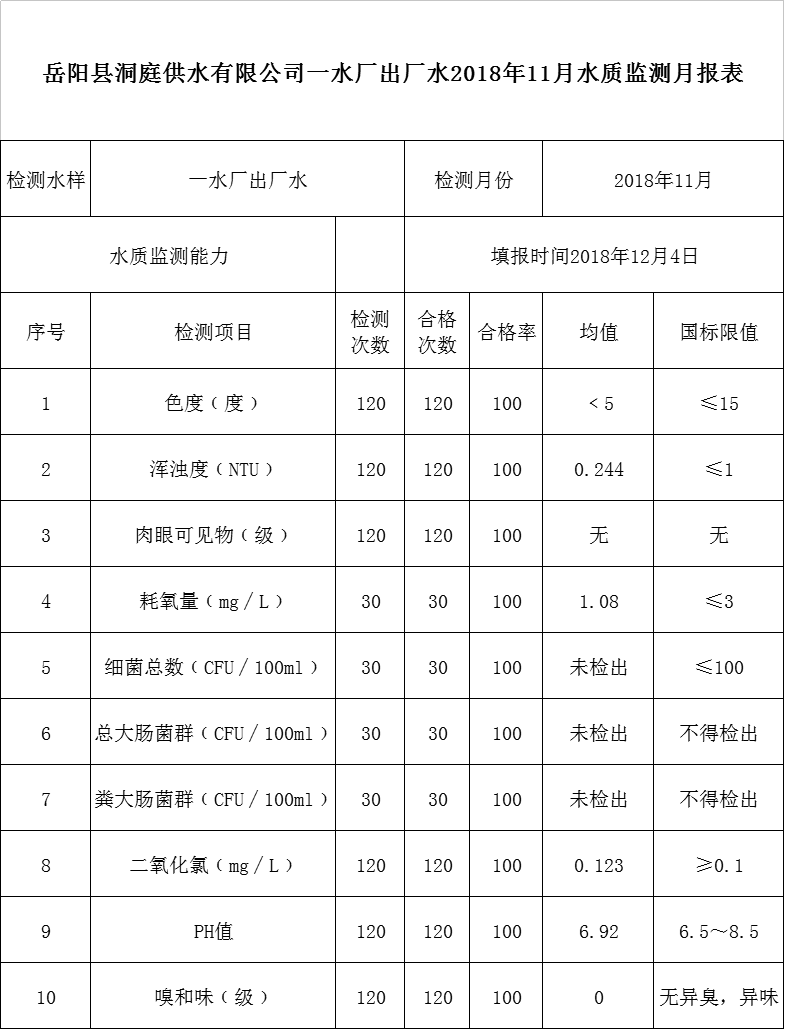 岳阳县洞庭供水有限公司一水厂出厂水2018年11月水质监测月报表