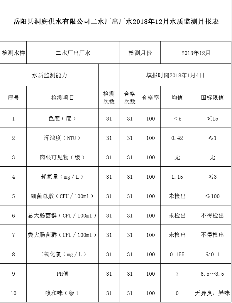岳阳县洞庭供水有限公司二水厂出厂水2018年12月水质监测月报表