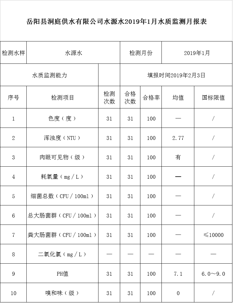 岳阳县洞庭供水有限公司水源水2019年1月水质监测月报表