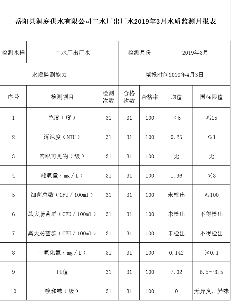 岳阳县洞庭供水有限公司二水厂出厂水2019年3月水质监测月报表
