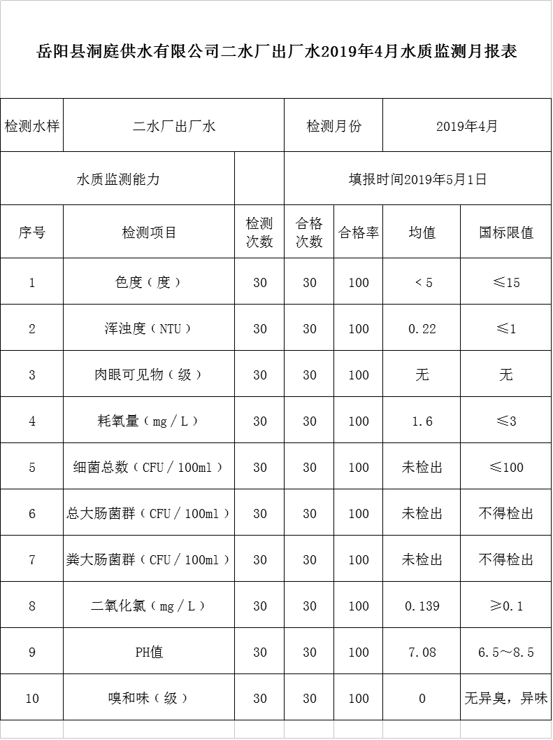 岳阳县洞庭供水有限公司二水厂出厂水2019年4月水质监测月报表