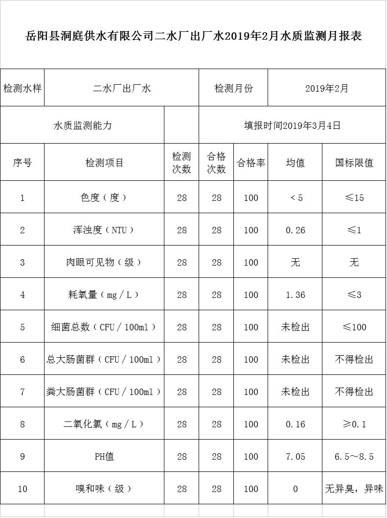 岳阳县洞庭供水有限公司二水厂出厂水2019年2月水质监测月报表
