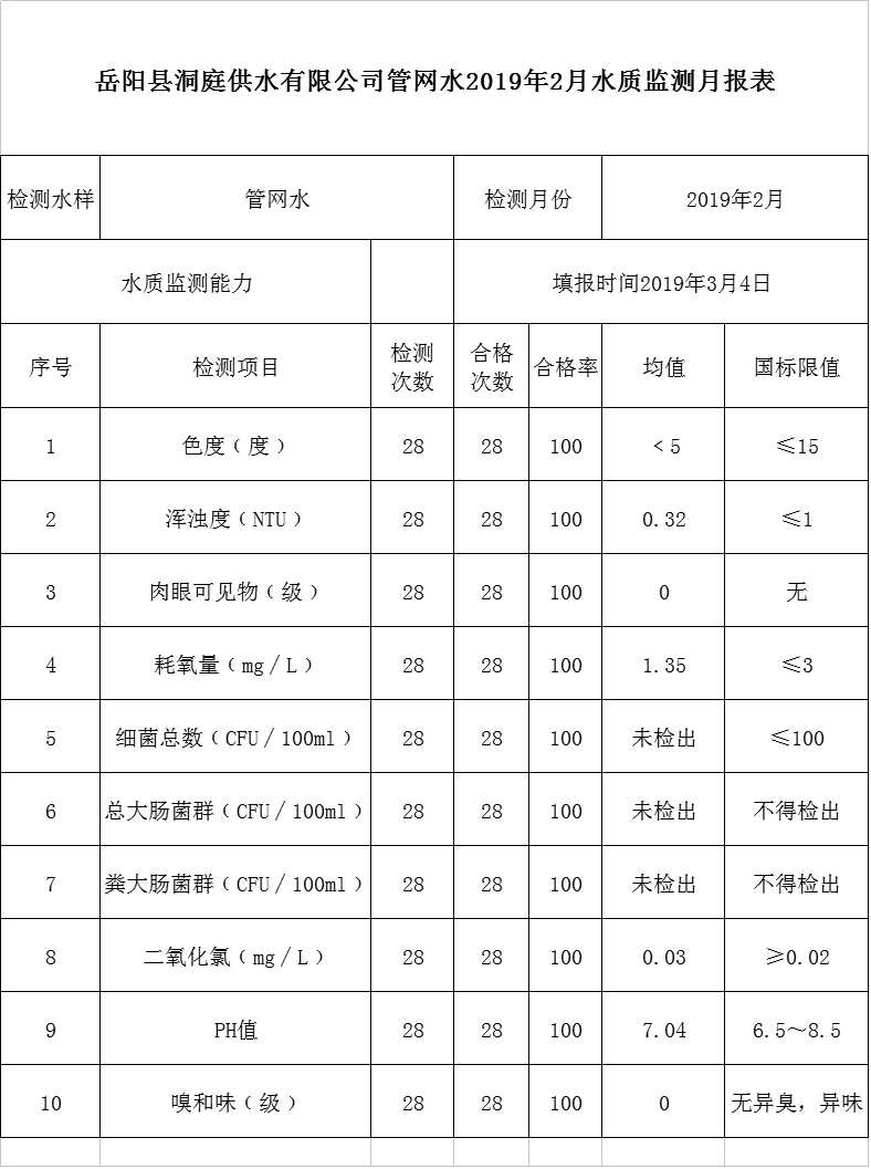 岳阳县洞庭供水有限公司管网水2019年2月水质监测月报表