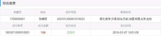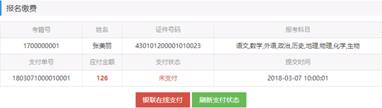 支付完成后,关闭支付页面。返回“报名缴费”页面,点击“刷新支付状态”按钮,如果支付状态是“已支付”,表示支付成功(如下图)。