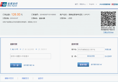 可以使用手机“云闪付”扫描右上角的二维码完成付款,也可使用银联卡直接付款,或者使用网银支付,具体操作可参考页面“新手操作演示”等帮助信息。