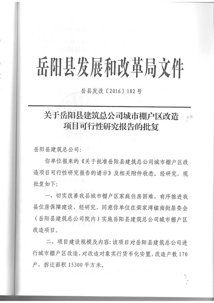 关于岳阳县建筑总公司城市棚户区改造项目可行性研究报告的批复