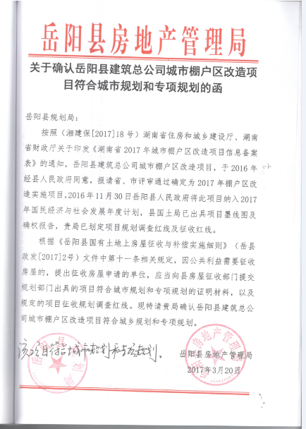 关于确认岳阳县建筑总公司城市棚户区改造项目符合城市规划和专项规划的函