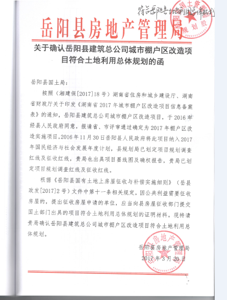 关于确认岳阳县建筑总公司城市棚户区改造项目符合土地利用总体规划的函