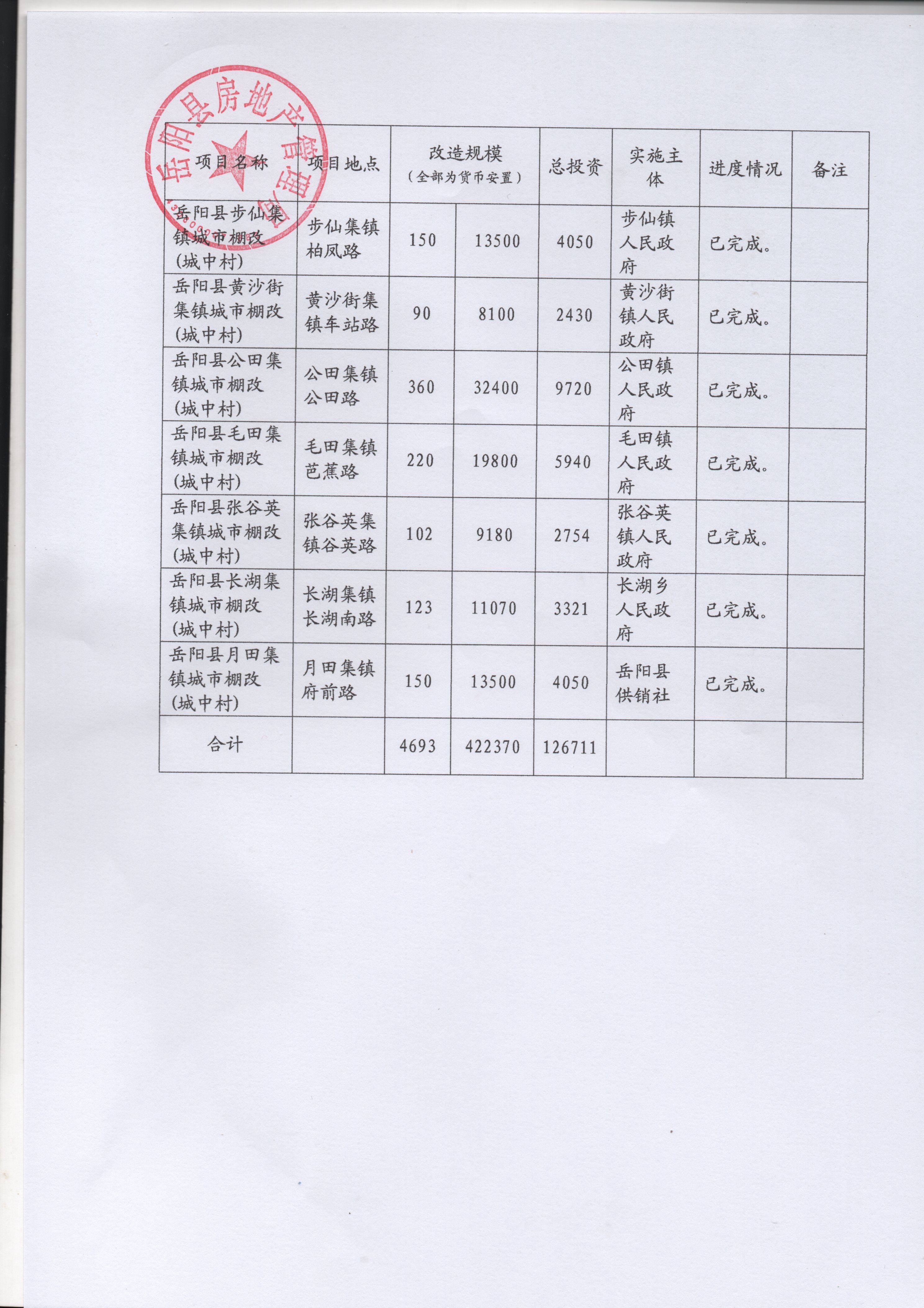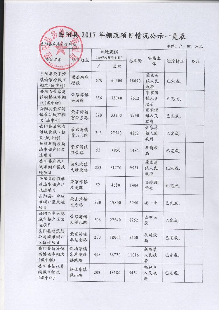 岳阳县2017年棚改项目情况公示一览表