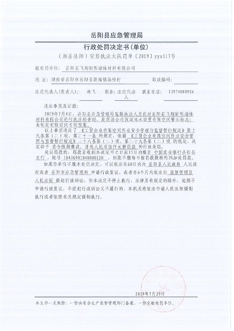 行政处罚决定书(湘岳岳阳安监执法大队罚单〔2019 〕yyx117号)