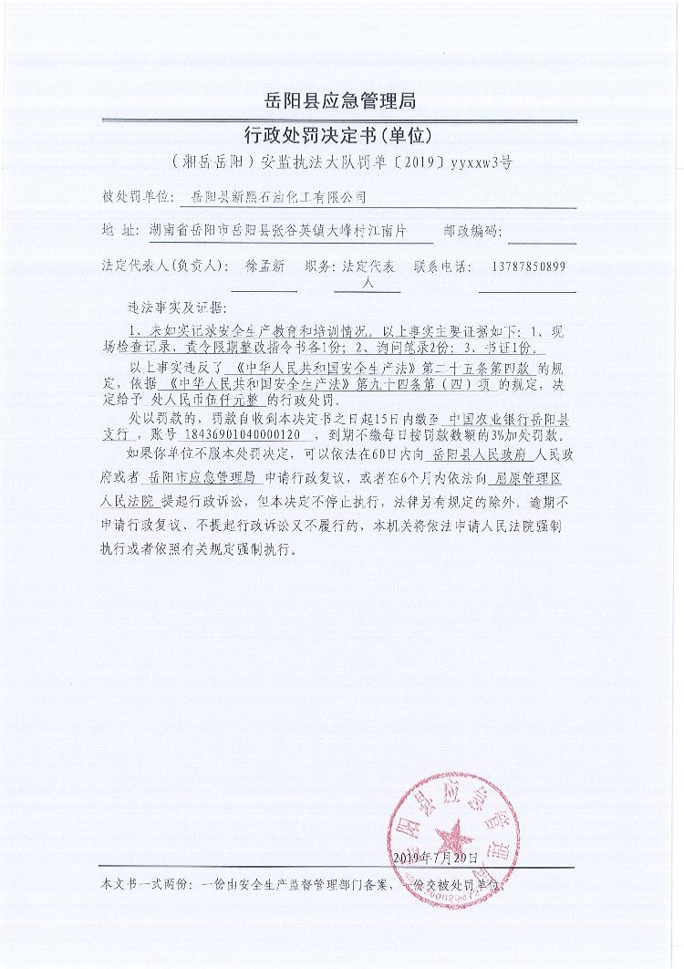 行政处罚决定书(湘岳岳阳安监执法大队罚单〔2019 〕yyxxw3号)