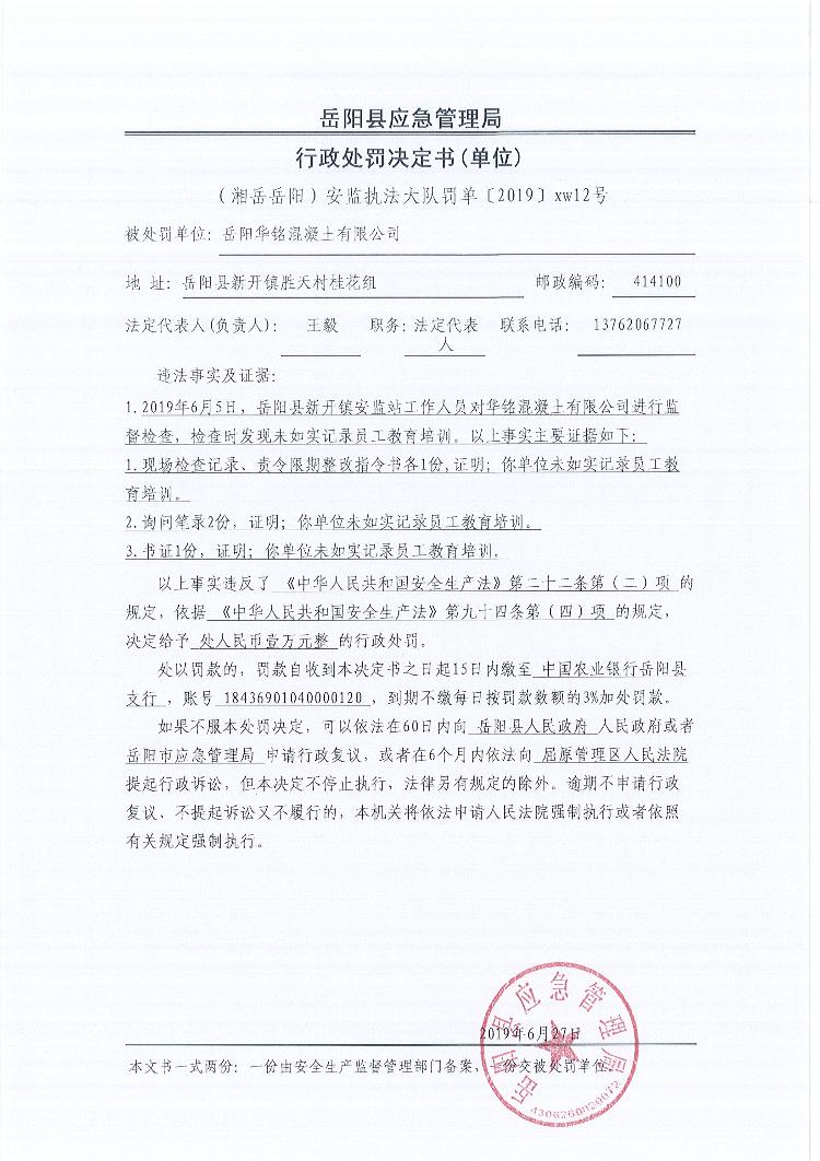 行政处罚决定书(湘岳岳阳安监执法大队罚单〔2019 〕xw12号)