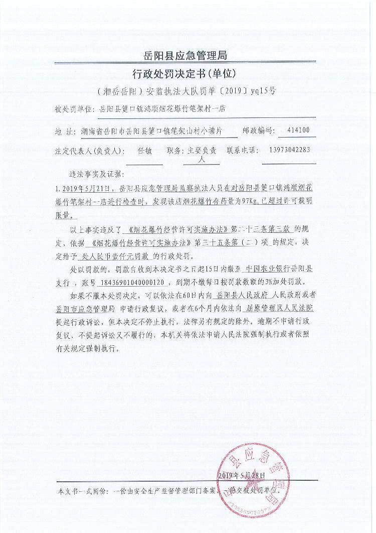 行政处罚决定书(湘岳岳阳安监执法大队罚单〔2019 〕yq15号)