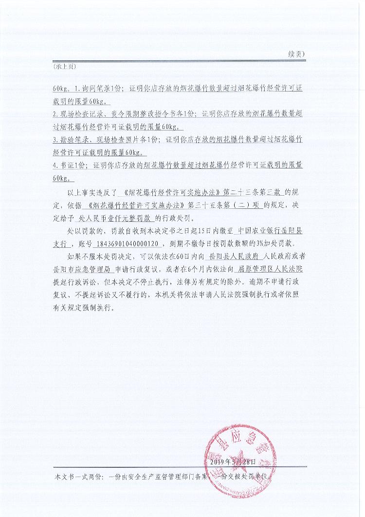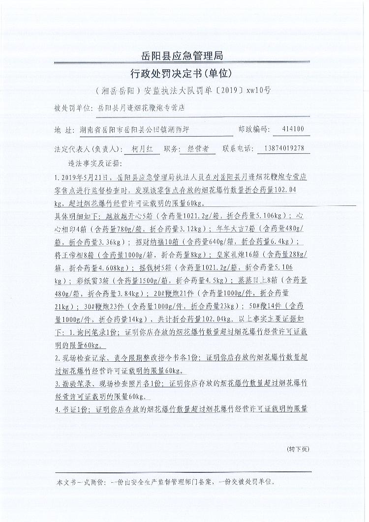 行政处罚决定书(湘岳岳阳安监执法大队罚单〔2019 〕xw10号)