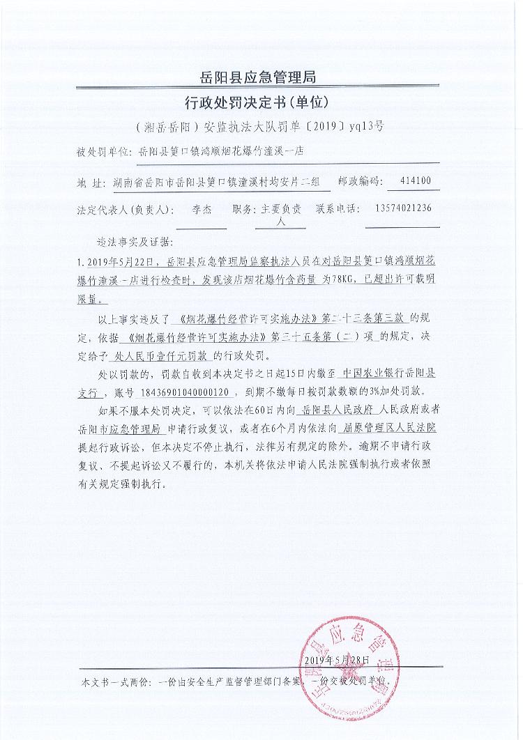 行政处罚决定书(湘岳岳阳安监执法大队罚单〔2019 〕yq13号)
