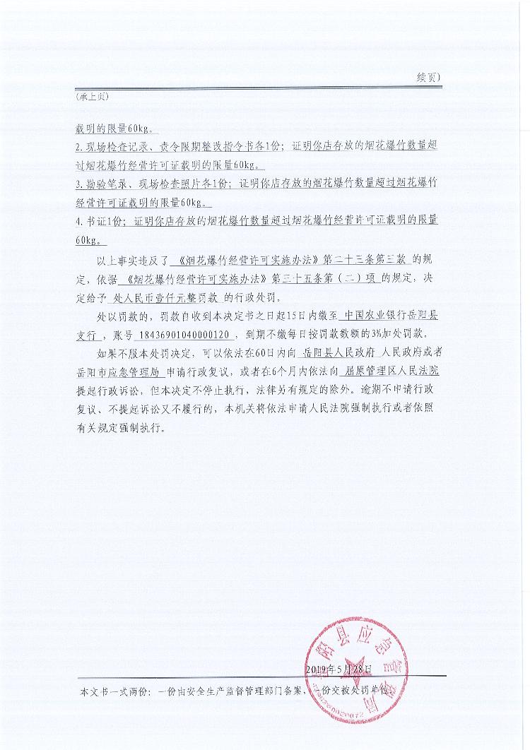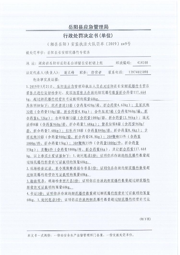 行政处罚决定书(湘岳岳阳安监执法大队罚单〔2019 〕xw9号)