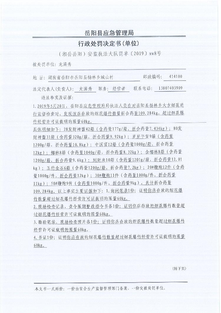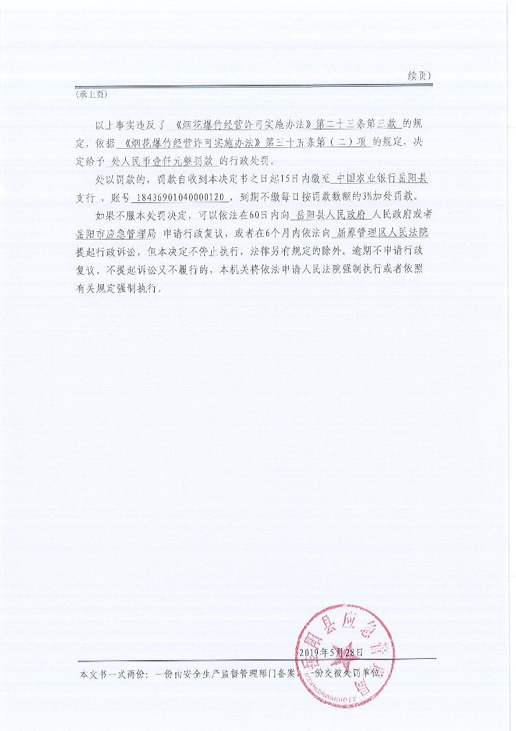 行政处罚决定书(湘岳岳阳安监执法大队罚单〔2019 〕xw8号)