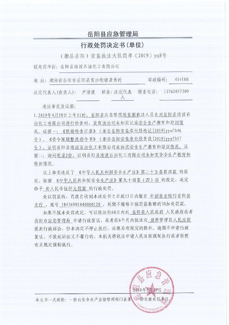 行政处罚决定书(湘岳岳阳安监执法大队罚单〔2019 〕yq8号)